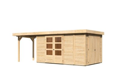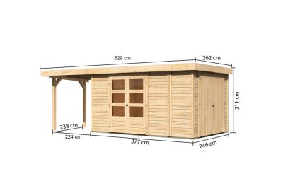 új Karibu Retola 6. Lapostetős nagyméretű kerti ház beépített oldalsó tárolóval, bővítménnyel/terasszal, natúr fából 597 cm x 246 cm