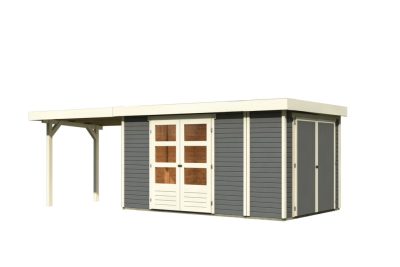új Karibu Retola 6. Lapostetős nagyméretű kerti ház beépített oldalsó tárolóval, bővítménnyel/terasszal, terra szürke színű fából 632 cm x 246 cm