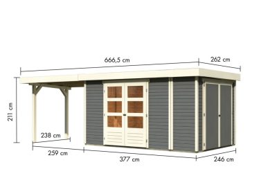 Karibu Retola 6. Lapostetős nagyméretű kerti ház beépített oldalsó tárolóval, bővítménnyel/terasszal, terra szürke színű fából 632 cm x 246 cm
