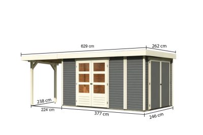 Karibu Retola 6. Lapostetős nagyméretű kerti ház beépített oldalsó tárolóval, bővítménnyel/terasszal,terra szürke színű fából 597 cm x 246 cm