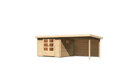 Karibu Trittau 3. Nagyméretű kerti ház 38mm-es falvastagsággal, hátfallal rendelkező bővítménnyel/ terasszal, natúr fából 580,5 cm x 297 cm