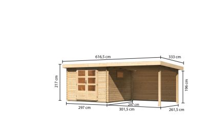 új Karibu Trittau 3. Nagyméretű kerti ház 38mm-es falvastagsággal, hátfallal rendelkező bővítménnyel/ terasszal, natúr fából 580,5 cm x 297 cm