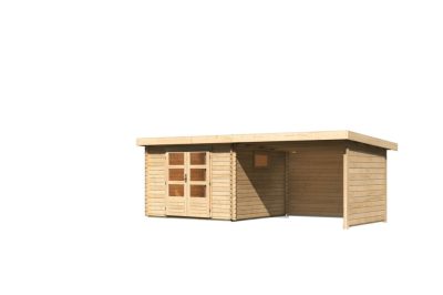 Karibu Trittau 3. Nagyméretű kerti ház 38mm-es falvastagsággal, oldal- és hátfallal rendelkező bővítménnyel/ terasszal, natúr fából 580,5 cm x 297 cm