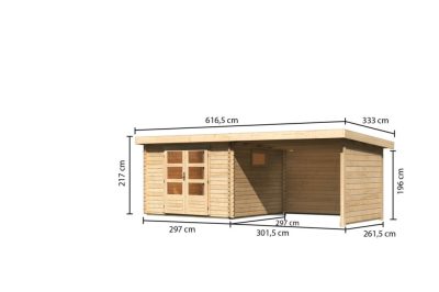 új Karibu Trittau 3. Nagyméretű kerti ház 38mm-es falvastagsággal, oldal- és hátfallal rendelkező bővítménnyel/ terasszal, natúr fából 580,5 cm x 297 cm