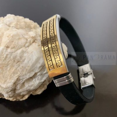 Férfi karkötő Kaucsuk-acél kombinációval. Felső lapja aray színnel díszített.