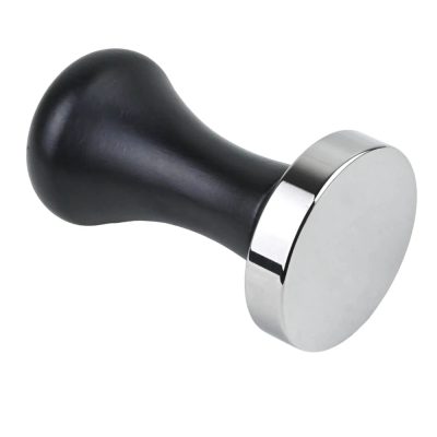 Fekete festett fa nyelű tamper, 58,5 mm-es átmérőjű rozsdamentes acélból készült talppal.