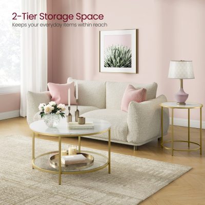 Kávasztal, nappali asztal, kanapé melletti koktélasztal, műmárvány kerek, edzett üveg tárolós polccal, könnyen összeszerelhető, modern stílus, nappaliba, fehér márvány és fém arany színben