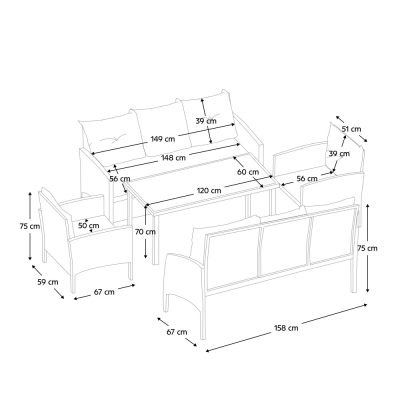 Anyag: technorattan/poliészter/acél/edzett üveg Szín: fekete/szürke párnák Asztal (SzxMéxMa): 120x60x70 cm Fotel (SzxMéxMa): 59x67x75 cm Hármas ülés (SzxMéxMa): 158x67x75 cm Ülés mélysége párnával: 41 cm Ülés szélessége nélkül párnával: 36 cm Ülés magassága: 36 cm Ülés mélysége: 56 cm Fotel ülésének szélessége: 50 cm Háttámla szélessége: 51 cm Hármas ülés szélessége: 148 cm Hármas ülés hátának szélessége: 149 cm Háttámla szélessége 39 cm Fotel teherbírása: 100 kg Padok teherbírása: 90 kg/személy Asztal teherbírása: 70 kg 5 részes szett 2x rattan hármas ülés 2x rattan fotel Asztallal Edzett üveggel (5 mm) Díszpárnák nélkül szállítva Párna vastagsága: 5 cm Párnákkal szállítva Lehúzható vízálló huzat A huzatok 30°C-on moshatók Szétszerelve szállítva