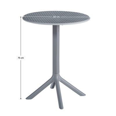 Anyag: műanyag Szín: szürke Méretek (SzxMéxMa): 60x60x75 cm Teherbírás: 50 kg Súly: 3,5 kg Étkezőasztal Kerti asztal Egyszerű Praktikus Lábakon Beltérre és kültérre egyaránt alkalmas Összeszerelve szállítva