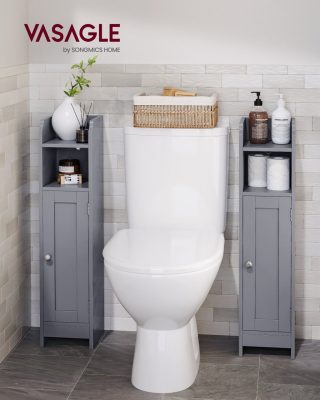 VASAGLE keskeny fürdőszobai álló tárolószekrény ajtóval és polcokkal, szabadon álló fürdőszobai tároló, keskeny WC-papír tárolószekrény, állítható polcokkal, galambszürke