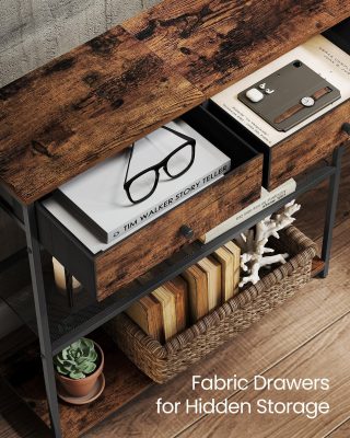 Keskeny konzolasztal 2 szövetfiókkal, 3 szintes előszobai kanapétáblához, 24 x 76 x 80 cm, folyosóra, nappaliba, rusztikus barna és tinta fekete színben