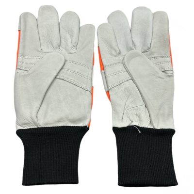 Ezek a jól látható, bőr láncfűrész-kesztyűk védelmet nyújtanak a bal oldali fűrészelés számára.