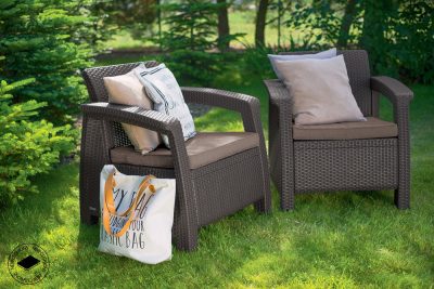 A KETER CORFU DUO fotelkészlet nagyon modern és kényelmes bútor, mely kül - és beltéren egyaránt használható. A polyrattan anyagnak köszönhetően masszívabb és ellenállóbb a bútor az időjárás viszontagságai ellen. A csomag tartalmazza a kényelmes párnákat is.