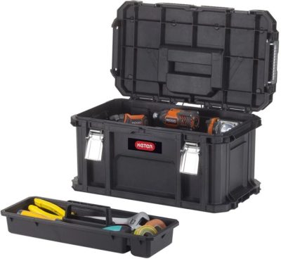 A tágas szerszámosláda ideális nagyobb szerszámok tárolásához, helyet kapott benne egy kivehető tálca is a legfontosabb szerszámoknak.