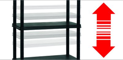 A Keter PLUS 60/5 állvány magasított lábakkal rendelkezik, így a tárolt tárgyak nem érintkeznek közvetlenül a padlóval, a takarítás pedig egyszerűbb és higiénikusabb. Az állítható polcok segítségével a polcok magassága igény szerint módosítható, így a tárolórendszer könnyedén az egyéni igényekhez igazítható.
