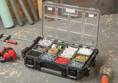 A ROC Pro Gear 1.0 Rendszerező kompakt kialakításával és strapabíró szerkezetével olyan szakembereknek való, akik funkcionális, hordozható és strapabíró rendszerezőt keresnek, amely nap mint nap képes elvégezni a munkát. Ez a tartós, nagy ütésállóságú műanyagból készült professzionális rendszerező fém retesszel és három fogantyúval rendelkezik, amelyek többféle hordozási lehetőséget kínálnak. Tartalmaz 8 kis és 2 széles kivehető tárolót a munka közbeni gyors hozzáférés érdekében. A víz- és porálló peremmel kiegészített szervezővel mindenféle időjárási körülmények között dolgozhatsz. A ROC Pro Gear 1.0 Rendszerező kompatibilis a moduláris és egymásra rakható Professional Tool Storage Rendszer 1.0 és 2.0 (kivéve a kompakt rendszerezőt) szerszámtároló rendszerrel.