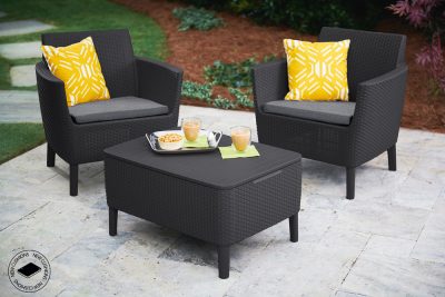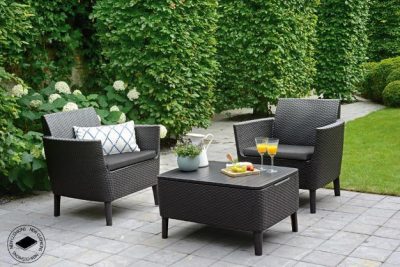 Ez a típusú bútor garnitúra elegáns, modern és retro stílusú, rattan utánzatú öntött műanyagból készült. A két fotelből és egy funkcionális asztalból álló szett kiválóan ellenáll az időjárási viszonyoknak és az UV sugárzásnak is. A szettet kültéren és beltéren egyaránt lehet használni. A készlet tartalmazza a stílusos párnákat is, melyeket a funkcionális asztalban lehet tárolni.