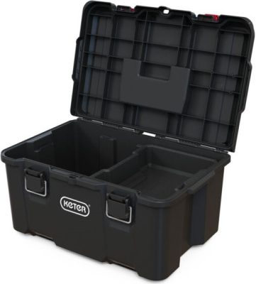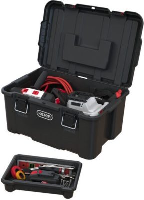 A tetejét felnyitva egy tágas rekeszben tárolhatók a nagyobb szerszámok, melyek biztonságos tárolásáról erős kapcsos zárak gondoskodnak.