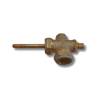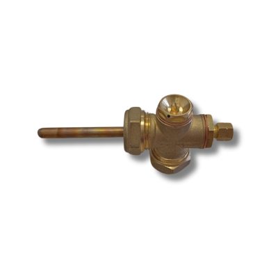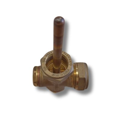 Kézi légtelenítő szelep hőmérséklet érzékelő hüvellyel szolár vagy fűtés rendszerhez. Tiszta rézből, KÉT 22 mm-es roppantós csatlakozással