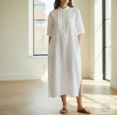 Ez a lágy esésű, hófehér lenruha ideális választás azoknak, akik értékelik a kifinomult, mégis természetes stílust. A ruha különlegessége a frontrészen található, precízen kidolgozott rakott díszítés, amely textúrát és egyedi karaktert kölcsönöz a darabnak.