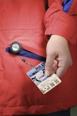 Kihúzható névkitűzőtartó, karabiner rögzítéssel, mely biztonságban tartja a vastagabb kártyákat is.