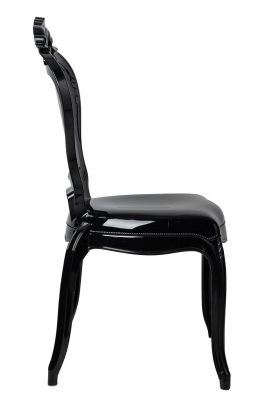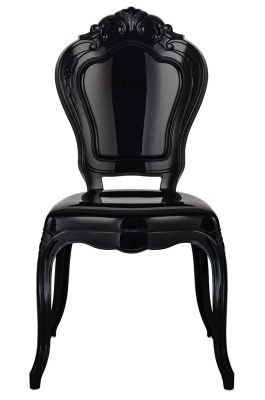 A King szék a klasszikus barokk stílus modern újraértelmezése. A fényes fekete polikarbonát anyag és a kifinomult vonalvezetés egyedi megjelenést kölcsönöz ennek a különleges bútordarabnak. A szék teljes egészében tartós műanyagból készült, amely egyesíti a könnyű súlyt a kiemelkedő teherbírással.