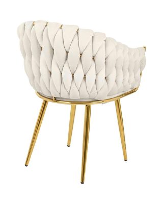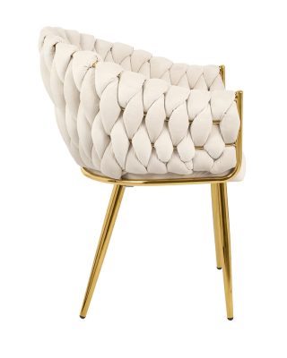 A TRESSE fotel a modern luxus és a funkcionalitás tökéletes ötvözete. A bézs velúr kárpitozás és az arany színű fém váz harmonikus kombinációja azonnal a figyelem középpontjába kerül. A fonott háttámla nem csak egyedi megjelenést kölcsönöz, de optimális támaszt is biztosít.