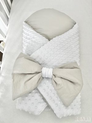 • Kókuszpólya – Ross fehér minky és szürke pamut, 80×80 cm | Uniszex, masnival és kókuszbetéttel