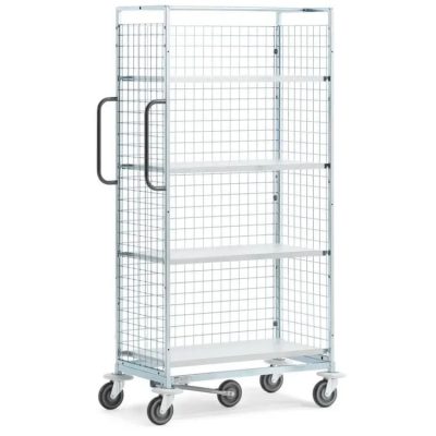 KT3 szennyestartó rácsos kocsi, rugalmasan beállítható polcok a kényelmes kezelés érdekében. Fordulékony, könnyen manőverezhető az 5. kerék révén. 2 tolófogantyú.