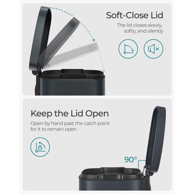 • [Lágyan záródó, szagzáró fedél] Ez a pedálos szemetes lassú és csendes, lágyan záródó fedéllel rendelkezik.A fedél szoros tömítése megakadályozza a tartós szagok kialakulását