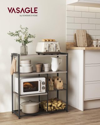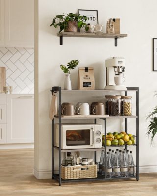 • [Sokoldalú] Több polcszinttel a konzervek és tányérok számára, 29 cm mély rácsos kosarakkal a gyümölcsök számára és 6 akasztóval a konyhai eszközöknek, ez a konyhapolc tökéletes támogatást nyújt a finomságok elkészítésében.