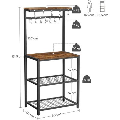Állópolc 60 x 40 x 151,5 cm, Konyhai polc, Mikrohullámú polc 12 kampóval és fém kerettel, Ipari kivitel, mikrohullámú sütőhöz, edények, Vintage barna/fekete