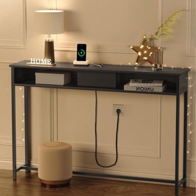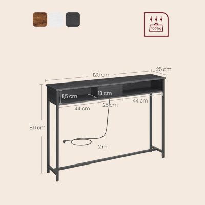 konzolasztal aljzatokkal, keskeny oldalsó asztal 2 nyitott fiókkal, vékony, 25 x 120 x 81,1 cm, helytakarékos bejárathoz, nappaliba, szürke tinta fekete:
