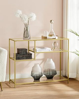 • Luxus és praktikus: Az arany színű keret és az elegáns edzett üveg luxus és praktikus konzolasztalt alkot. Az aszimmetrikus polcok nemcsak bőséges teret biztosítanak, hanem egyedi varázst is adnak szobájának