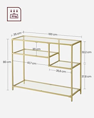 Konzolasztal Előszoba Asztal Oldalasztal Edzett üveg fém keret polcokkal, 35 x 100 x 80 cm Modern előszoba nappali Arany szín
