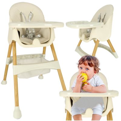 Krémszínű állítható magasságú etetőszék tálcával és alsó tárolóval