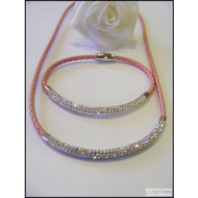 Kristályokkal díszített ékszer szett, amihez bőr nyaklánc és karkötő tartozik . A kristályok káprázatosan csillognak az íves nemes acél foglalatban. Mágneses zárral kapcsolódik. Több színben is kapható.