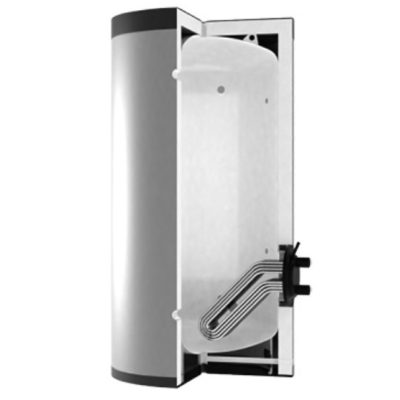 Álló kivitelű HMV tároló, POLYWARM® belső bevonattal, egy hőcserélővel ami utólag be tehető illetve kivehető, puha műgyapjú hőszigetelése levehető és tűzálló, ami 100%-ig újrahasznosított anyagokból készült.