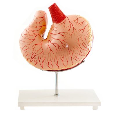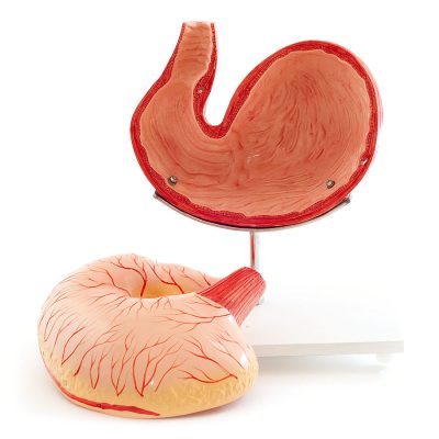 Ez az anatómiai modell két részre bontható, és egyértelműen, átláthatóan illusztrálja a kutya gyomrának anatómiáját és belső összetételét. A modell fehér fa alapra van szerelve.