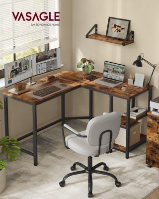 L-alakú számítógép asztal, 120 x 130 x 76 cm, játékasztal, munkapont 2 tárolópolccal, otthoni irodához, helytakarékos, könnyen összeszerelhető, rusztikus barna és tinta fekete színben