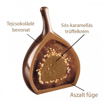 Sós-karamellás trüffelkrémmel töltött aszalt füge tejcsokoládéba mártva.