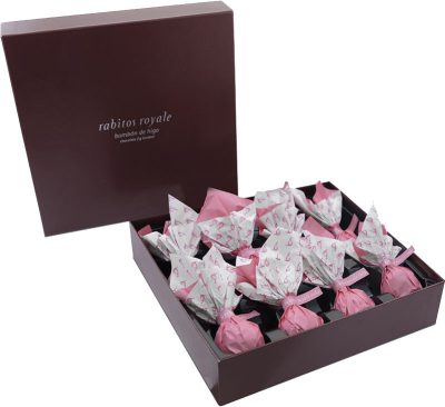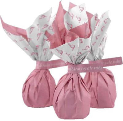 Pezsgőkrémes fehér csokoládé trüffellel töltött aszalt füge, Ruby csokoládéba mártva.