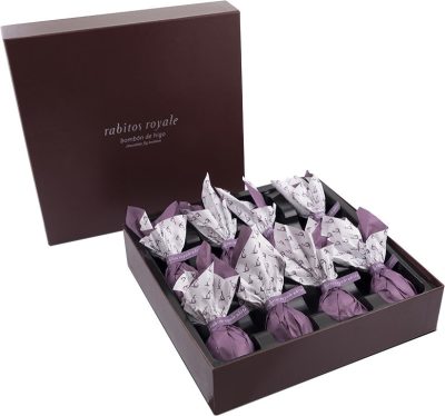 Epres trüffelkrémmel töltött aszalt füge fehér csokoládéba mártva.