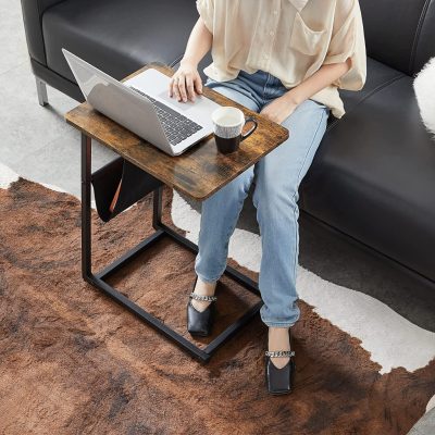 oldalsó asztal magazintartóval, C-alakú kanapéasztal, laptop asztal nappali hálószobába, acél váz, ipari stílusú, rusztikus barna és fekete