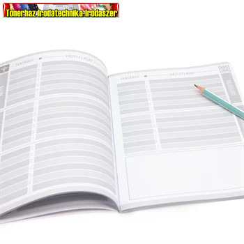 A/5 méretű, 38 lapos leckefüzet, melyben a leckék tantárgyanként napokra bontva rögzíthetők megjegyzésekkel kiegészítve.
