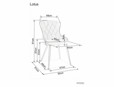 A Lotus Elegance étkezőszék a modern design és a klasszikus kényelem tökéletes ötvözete. A szék bézs színű, puha bársony kárpitozással és elegáns steppelt háttámlával rendelkezik. A fekete matt fém lábak stabil alapot biztosítanak, miközben karcsú megjelenést kölcsönöznek a széknek. A szék 91 cm magas háttámlája és az 51 cm-es ülésmagasság optimális támasztékot nyújt.
