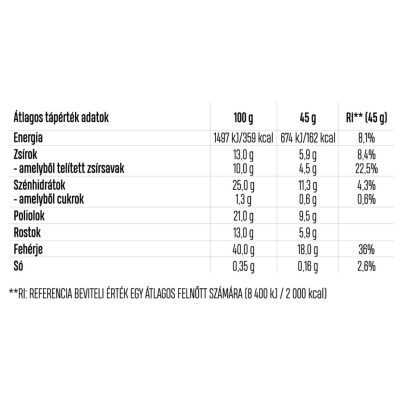 Figyelmeztetés:A temék több, mint 10 g/100 g poliolt tartalmaz. Nagyobb mennyiség fogyasztása hashajtó hatású. A termék nem helyettesíti a kiegyensúlyozott táplálkozást és egészséges életmódot.