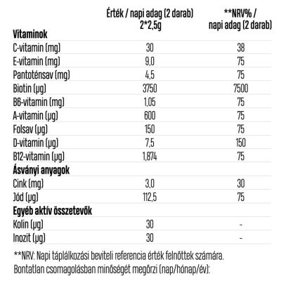 Cink és jód: A cink hozzájárul a haj, bőr és körömnormál állapotának fenntartásához. A jód hozzájárul a bőr normál állapotának megőrzéséhez.