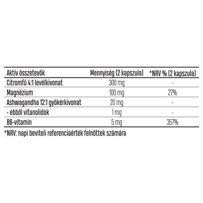 Magnézium-biszglicinát, Citromfű (Melissa officinalis) 4:1 levélkivonat, kukoricakeményítő, kapszulahéj (Hidroxipropil-metil-cellulóz), KSM-66® Ashwagandha (Withania Somnifera Dunal) 12:1 gyökérkivonat, csomósodást gátló anyag (zsírsavak magnéziumsói), piridoxin-hidroklorid. [A KSM-66® az Ixoreal Biomed Inc. bejegyzett védjegye].