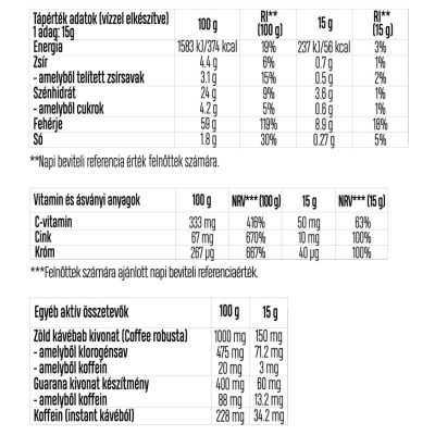 Összetevők: instant tejsavófehérje koncentrátum (tej) {tejsavófehérje koncentrátum (tej), emulgeálószer [lecitinek (szója)]}; aromák; instant kávé; só; színezék (ammónia karamella); zöld kávé (Coffea robusta) babkivonat; guarana kivonat készítmény [guarana (Paullinia cupana) mag kivonat, maltodextrin, koffein]; cink biszglicinát; C-vitamin (L-aszkorbinsav); csomósodást gátló anyag (szilícium-dioxid), édesítőszer (szukralóz); króm(III)-klorid.